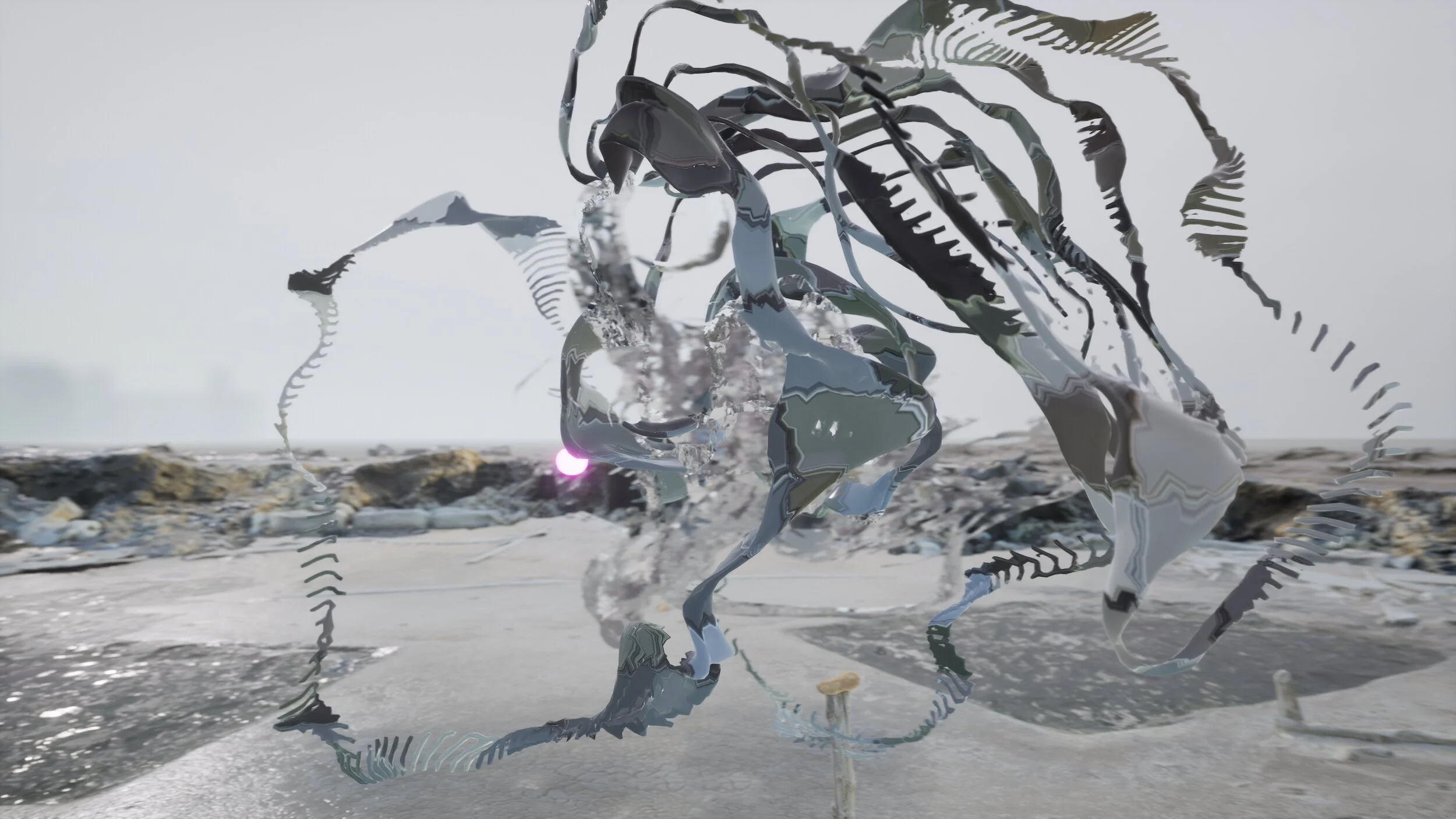 Steensen constructs non-linear narratives of events that unfold in micro-scale. A plant’s roots form a sprawling underground network that slowly attaches itself to a rock formation; a feather dissolves on a bed of dead matter, with its bone turning into a host for salt particles’ crystallisation, while algae and bacterial lifeforms absorb nutrients in a slowly oscillating rhythm, sedimenting a thin crust of microcystins on a mineral plate. Avian and amphibian vocalisations appear in his work as vivid forms, creating pulsating motions that then evaporate in a perceived distance. Crystalline minerals generate a range of intense patterns and effects transformed by the perception of wavelengths of light that reveal themselves in the form of different spectral hues.Liminal Lands is a transitional zone where fundamental energies of sun, wind, water and bacteria connect to participants' bodies in virtual reality. Through interactive multiplayer technology, physical movements, spatial sounds and textures synchronize into a musical composition driven by immersed participants. Liminal Lands reveals life-shaping transformations, invisible to the naked eye. It begins slow and rhythmic, guiding from the familiar human realm towards a metamorphosis of life and technology.”